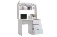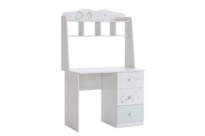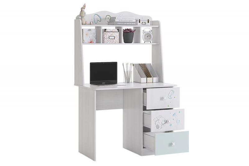 Стильный и модный стол детской «Бонни» - обрадует каждого ребенка. Компактный стол прекрасно впишется даже в маленькое пространство детской комнаты. Удобная столешница подойдет как для письма, так и для занятий на компьютере или ноутбуке. Открытые полки надстройки стола хорошо подходят для хранения учебников и школьных принадлежностей. В 3-х выдвижных ящиков поместится все, что необходимо для учебы и творчества. Необычный принтерный рисунок на фасадах выдержан в общем стилистическом решении. Рисунок устойчив к истиранию и ультрафиолету.