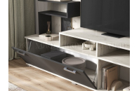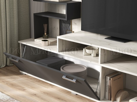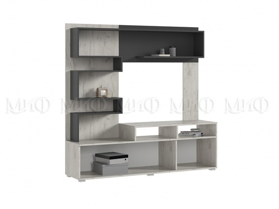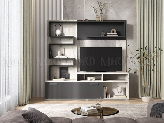 Основное предназначение стенки - установка видео-аудио техники, что делает ее отличным выбором для современной гостиной. В комплекте с стенкой идут тумба под ТВ и полка, что позволяет максимально эффективно использовать пространство.