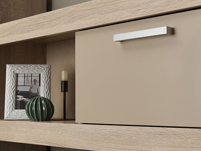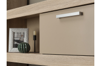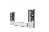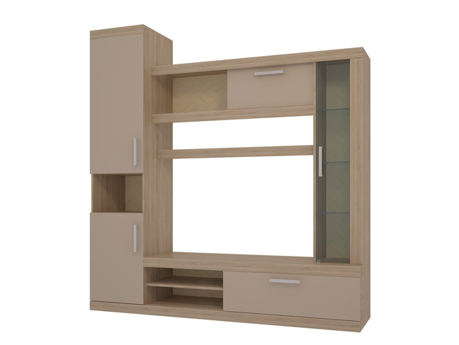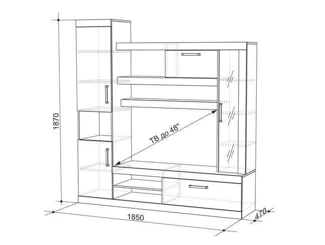 Мини стенка «Макси» — маленькая стенка с максимальными возможностями. Это небольшая по габаритам стенка выполнена в строгом европейском стиле, функциональна и лаконична. В ней Вы найдете множество вместительных шкафов для вещей, открытых ниш для аксессуаров и фоторамок, витрину под посуду и ниши под технику. В нише под ТВ разместится телевизор до 48 дюймов. Сборка мини стенки в одном положении — витрина со стеклом справа.