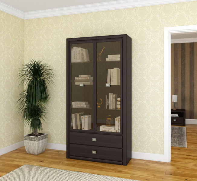Вместительный шкаф-витрина с распашными стеклянными дверками. Сквозь такие двери видно то, что находится внутри на полках. Ниже, под застекленным отсеком располагаются выдвижные ящики. В них удобно хранить то, что надо спрятать от посторонних глаз.