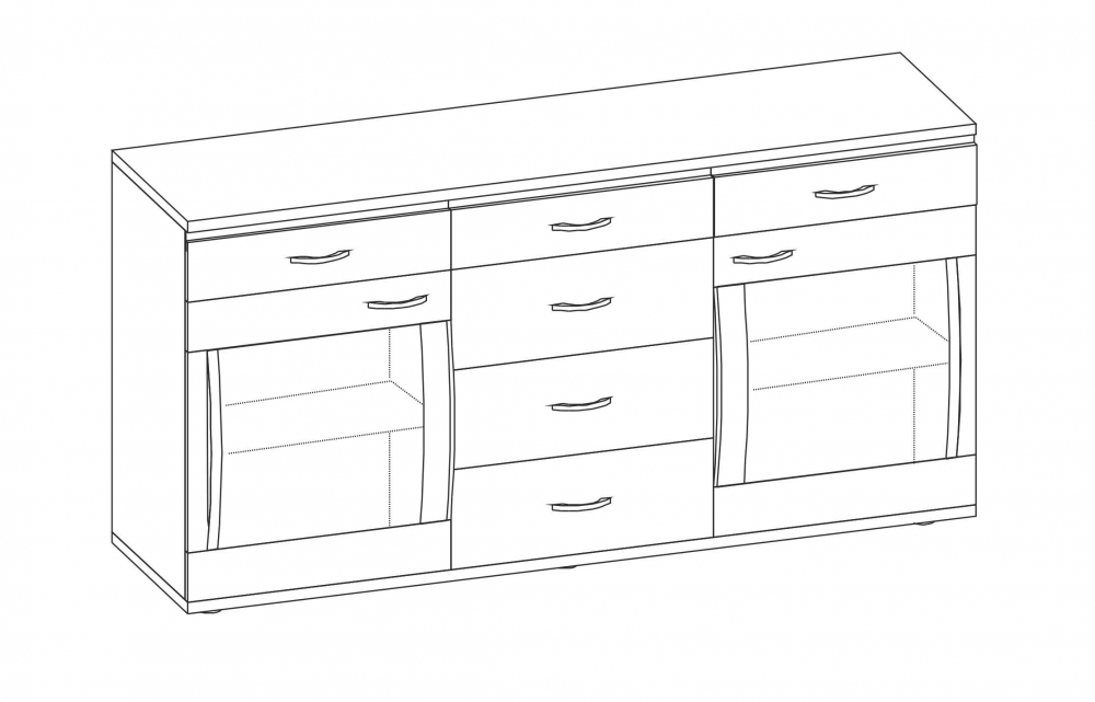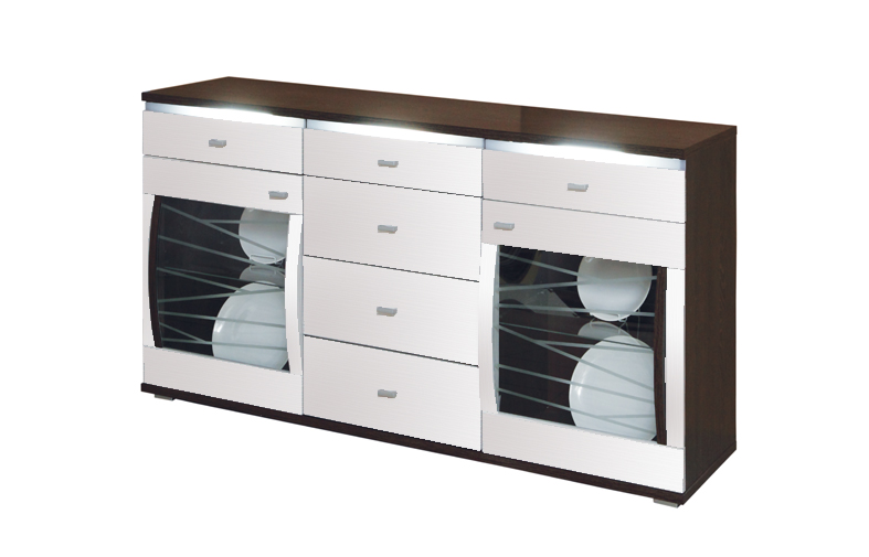 Комод 06.114 "Алабама" привлекает внимание красивым фактурным фасадом и стильным контрастным исполнением. Он имеет шесть выдвижных ящиков разного размера и два больших отсека с полками и распашными дверцами. Последние имеют вставки из прозрачных стёкол, которые украшаются пескоструйным рисунком. Шкаф можно использовать для хранения посуды, столового белья и разных мелочей.