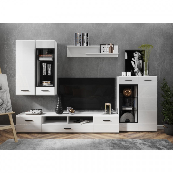 Гостиная Глосс — стильное решение для меблировки современного интерьера. Глянцевая поверхность белых фасадов придает помещению легкости. Вместительные элементы позволяют организовать удобную и продуманную систему хранения. Оригинальные дверцы ТВ-тумб, оснащенные газлифтом и петлями, откидываются вниз для экономии пространства.