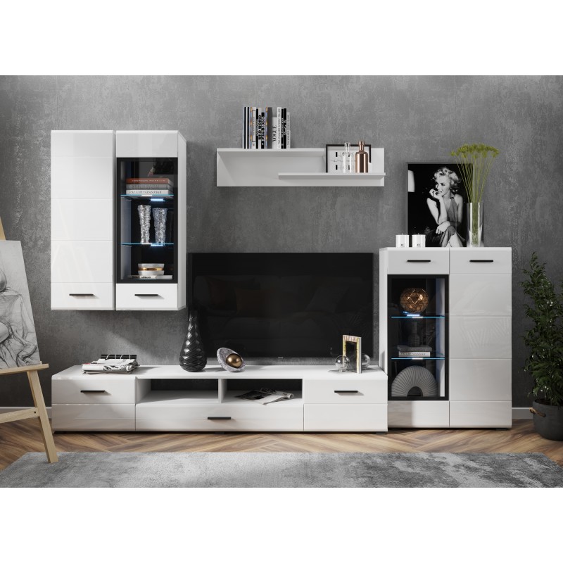 Гостиная Глосс — стильное решение для меблировки современного интерьера. Глянцевая поверхность белых фасадов придает помещению легкости. Вместительные элементы позволяют организовать удобную и продуманную систему хранения. Оригинальные дверцы ТВ-тумб, оснащенные газлифтом и петлями, откидываются вниз для экономии пространства.