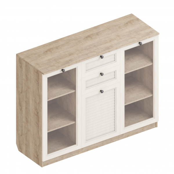 Стильный комод Филадельфия понравится тем, кто любит классический стиль.Необычное оформление фасадов гармонично вписывается в общий дизайн. Застекленные дверки придают лёгкости данной модели. Несколько выдвижных ящичков по центру конструкции и закрытый отсек с полкой позволят разместить необходимые Вам предметы быта. Удобная и большая столешница может быть использована как дополнительная полка для сувениров и фото,а модульность набора мебели позволяет создать свой собственный, неповторимый комплект, который идеально впишется в интерьер любого помещения.