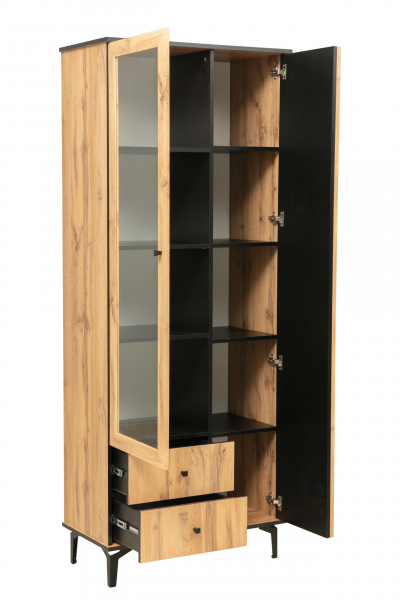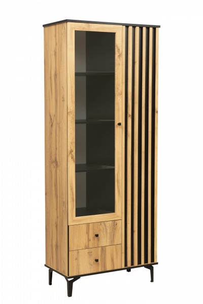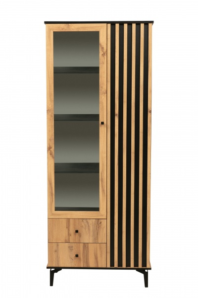 Шкаф комбинированный 51.02 Либерти (опора метал. h=150мм) (дуб вотан / черный / профиль: Masa Decor дуб вотан / стекло) совмещает благородную привлекательную эстетику с практичностью и хорошим функционалом. Продуманный дизайн уместно дополнит созданный интерьер и органично впишется в любое помещение.