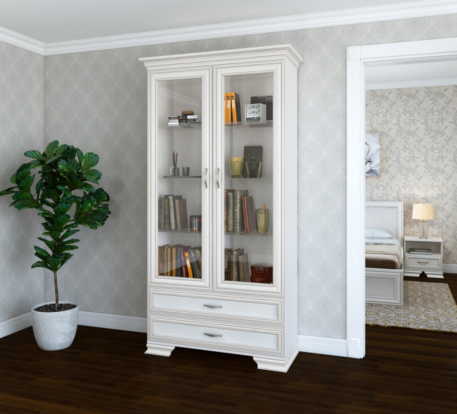 Шкаф-витрина станет практичной деталью в интерьере Вашего кабинета, гостиной, домашней библиотеки. Спокойный цвет смотрится благородно и элегантно. За застекленными дверками находятся полки для книг, аксессуаров. Нижнее отделение в виде двух ящиков можно использовать для хранения папок, бумаг, канцелярских принадлежностей.Изящный рамочный дизайн придает изделию благородство и особую привлекательность. Дополнительную элегантность придает карниз, а также красивые декоративные ручки.