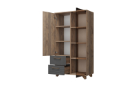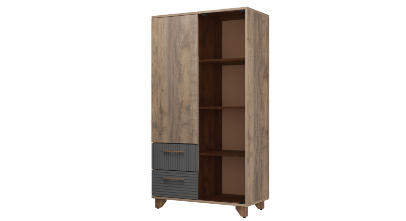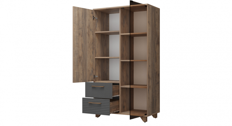 Стеллаж со стеклом — это практичное и дизайнерское решение для гостиной.Стеллаж имеет семь полок и два ящика. Ящики оснащены шариковыми направляющими полного выдвижения.Створки выполнены из ЛДСП и стекла, что позволяет хранить как необходимые предметы, так и предметы декора.Створки крепятся на петли с доводчиками для плавности хода. Конструкцией предусмотрен механизм открывания створок «push-to-open».Ручки ящиков из натурального массива дуба.Опоры изделия выполнены из массива дерева и имеют регулировку по высоте.