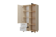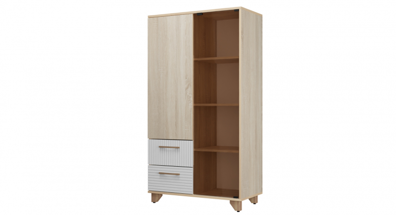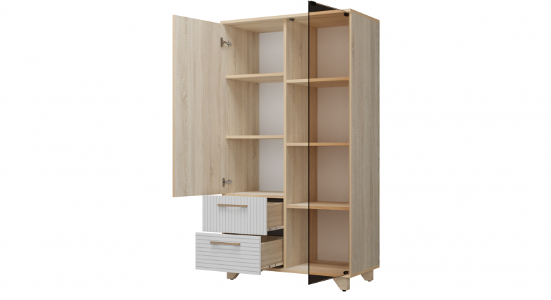 Стеллаж со стеклом — это практичное и дизайнерское решение .Стеллаж имеет семь полок и два ящика. Ящики оснащены шариковыми направляющими полного выдвижения.Створки выполнены из ЛДСП и стекла, что позволяет хранить как необходимые предметы, так и предметы декора.Створки крепятся на петли с доводчиками для плавности хода. Конструкцией предусмотрен механизм открывания створок «push-to-open».Ручки ящиков из натурального массива дуба.Опоры изделия выполнены из массива дерева и имеют регулировку по высоте.