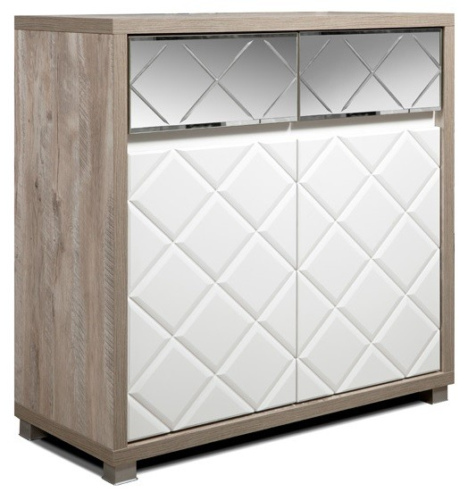 Стильная и функциональная тумба 2Д2Я Кристал выполнена в гармоничном сочетании цветов дуб юккон/белый жемчуг. Каркас изготовлен из ДСП толщиной 32 мм, что придает добротности и надёжности конструкции мебели. Дверка изготовлена из МДФ плёночного с эффектом Soft-touch. За дверками размещена несъёмная полка. Ящики на роликовых направляющих GTV. К накладкам ящиков крепятся зеркала с гравировкой в форме ромбов и фацетом по длинным сторонам.
