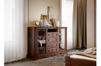 Стильная и функциональная тумба 2Д4Я Вагнер для спальни или гостиной. Содержит в правой и левой части по две съемные стеклянные полки толщиной 4 мм, в центральной части - одну открытую нишу сверху и четыре выдвижных ящика на шариковых направляющих. Фасады данной коллекции выполнены из эко-массива – материала, имитирующего древесину, в основе которого плита МДФ. В дверях - вставки из закаленного стекла с шелкотрафаретной печатью. Крышка, боковые стенки и двери дополнительно защищены лаком на водной основе. Дизайн мебели из модульного набора Вагнер отличается изысканным, элегантным дизайном и теплыми, натуральными оттенками в оформлении, а модульность коллекции позволяет создать свой собственный неповторимый набор, который идеально впишется в интерьер спальни.