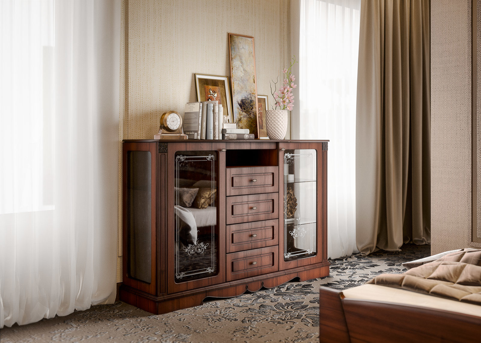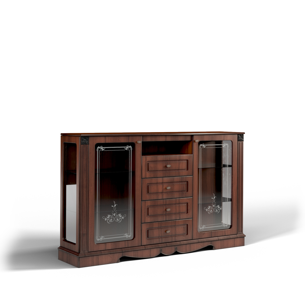 Стильная и функциональная тумба 2Д4Я Вагнер  для спальни или гостиной. Содержит в правой и левой части по две съемные стеклянные полки толщиной 4 мм, в центральной части -  одну открытую нишу сверху и четыре выдвижных ящика на шариковых направляющих. Фасады данной коллекции выполнены из эко-массива – материала, имитирующего древесину, в основе которого плита МДФ. В дверях - вставки из закаленного стекла с шелкотрафаретной печатью. Крышка, боковые стенки и двери дополнительно защищены лаком на водной основе. Дизайн мебели из модульного набора Вагнер отличается изысканным, элегантным дизайном и теплыми, натуральными оттенками в оформлении, а модульность коллекции позволяет создать свой собственный неповторимый набор, который идеально впишется в интерьер спальни.
