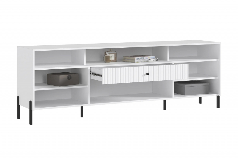 В тумбе три открытые полки, два отделения за распашными дверцами полками, отделение за откидной дверцей и выдвижной ящик. Такое деление помогает лучше организовать хранение вещей и поддерживать порядок.