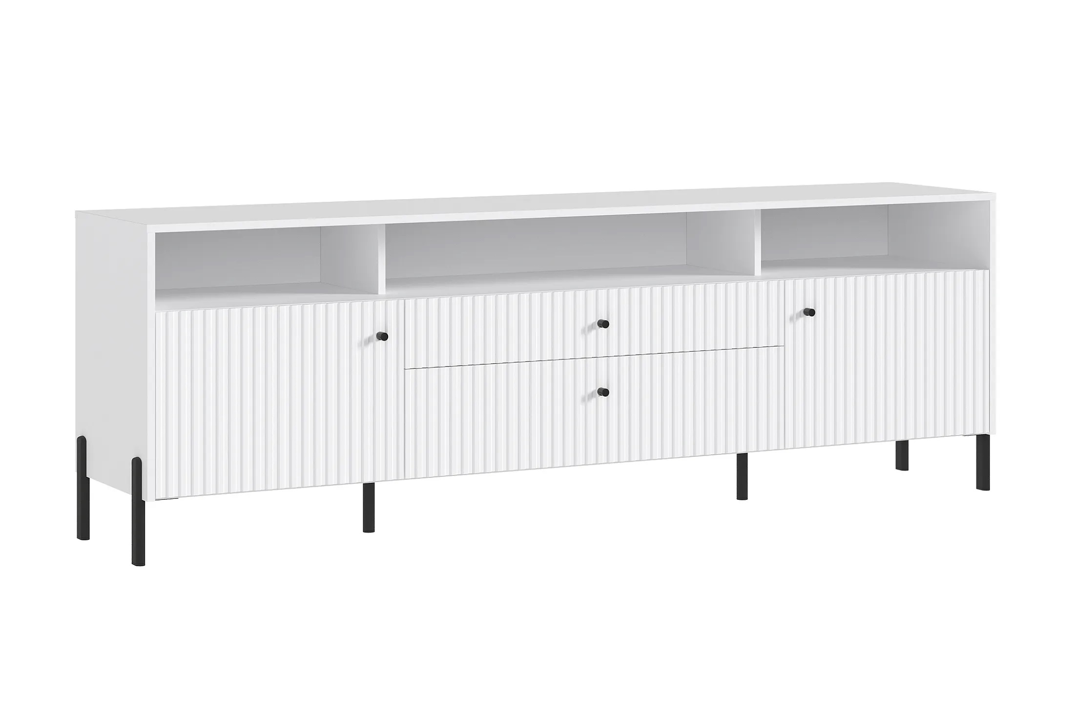 В тумбе три открытые полки, два отделения за распашными дверцами полками, отделение за откидной дверцей и выдвижной ящик. Такое деление помогает лучше организовать хранение вещей и поддерживать порядок.
