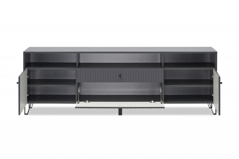 В тумбе три открытые полки, два отделения за распашными дверцами полками, отделение за откидной дверцей и выдвижной ящик. Такое деление помогает лучше организовать хранение вещей и поддерживать порядок.