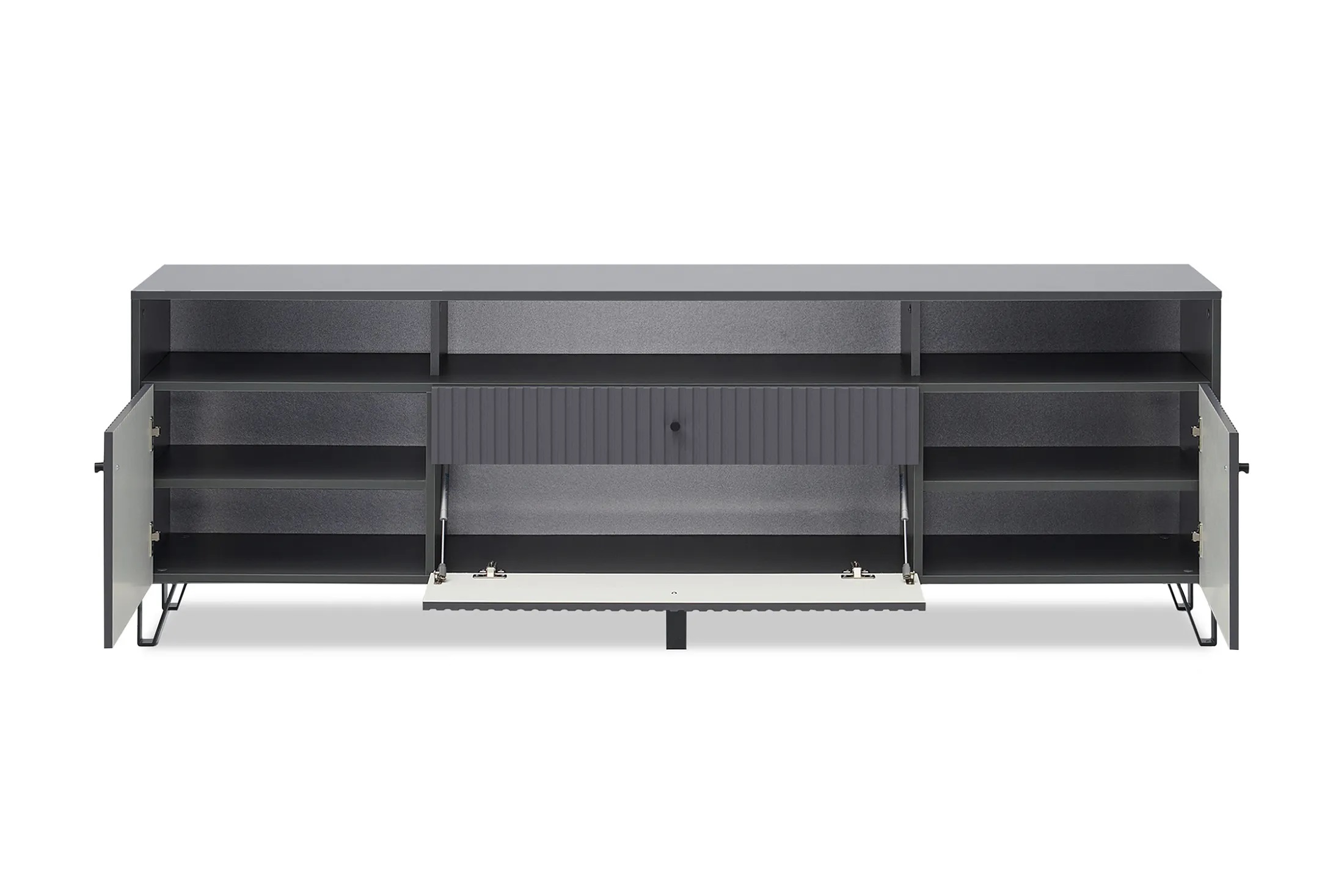 В тумбе три открытые полки, два отделения за распашными дверцами полками, отделение за откидной дверцей и выдвижной ящик. Такое деление помогает лучше организовать хранение вещей и поддерживать порядок.