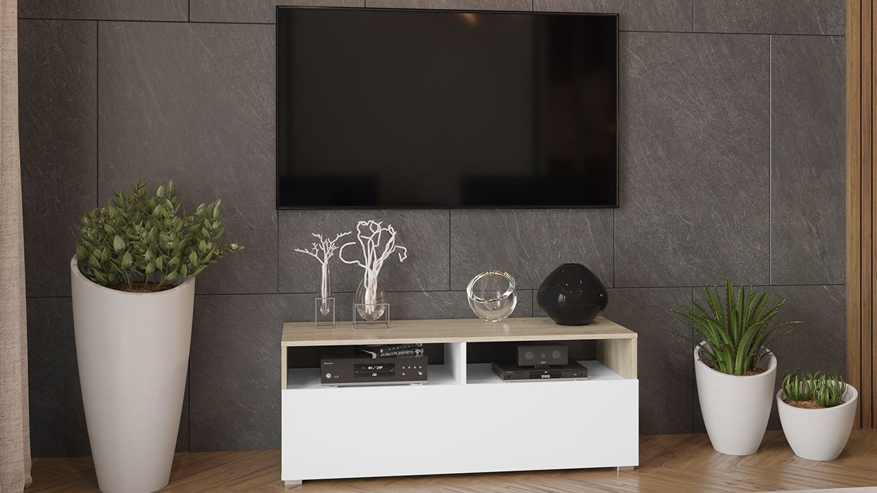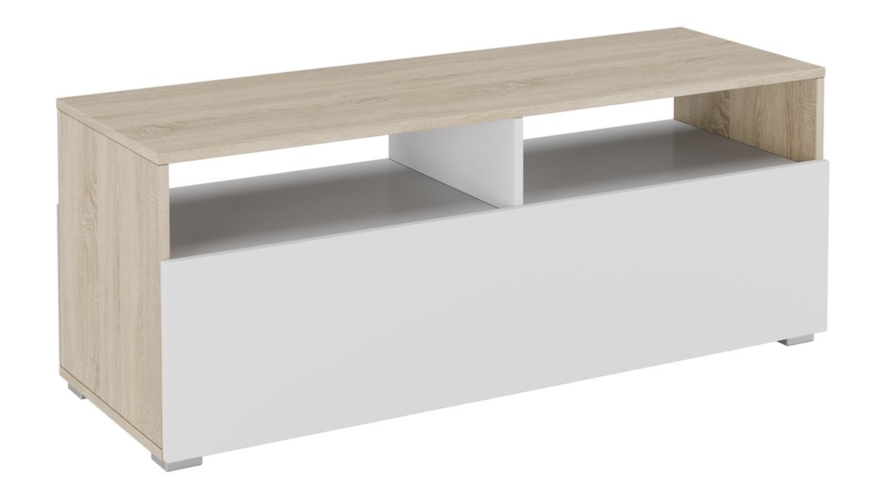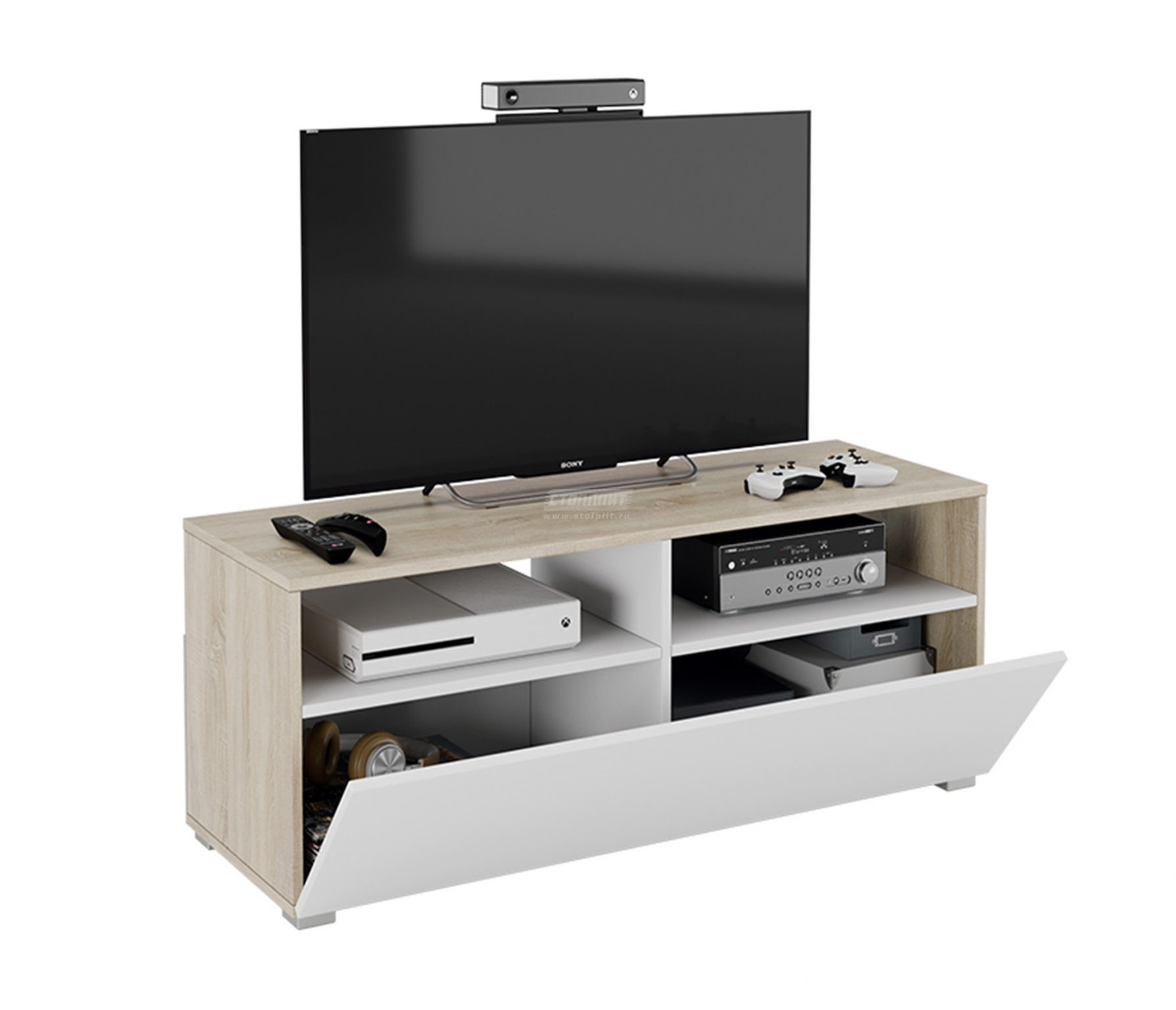 Тумба ТВ «Diamond» тип 6 — удобный и практичный вариант для хранения. Тумба выполнена в современном интерьере с довольно простой и незамысловатой геометрией. Модель оснащена двумя открытыми полками и большой скрытой нишей, которая открывается при помощи дверцы. Внутри за дверцей спрятаны еще несколько полок. На широкой поверхности тумбы можно разместить телевизор, а в нишах и в ящике хранить все необходимые вещи и другую технику.