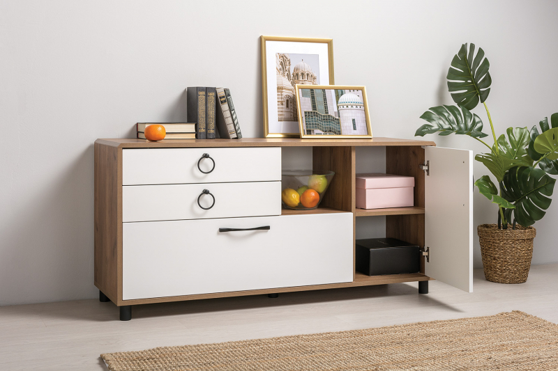 Тумба под ТВ Винтаж 13.283.07 будет отличным дополнением интерьера любой комнаты. Изделие поможет разместить телевизор для более комфортного просмотра новостей, сериалов и различных телепередач. Вместительный выдвижной ящик и полки, скрытые за распашными дверцами, пригодятся для хранения различных вещей и предметов. Регулируемые опоры позволяют легко компенсировать неровности пола. Образ тумбы дополняется интересной и стильной металлической фурнитурой.