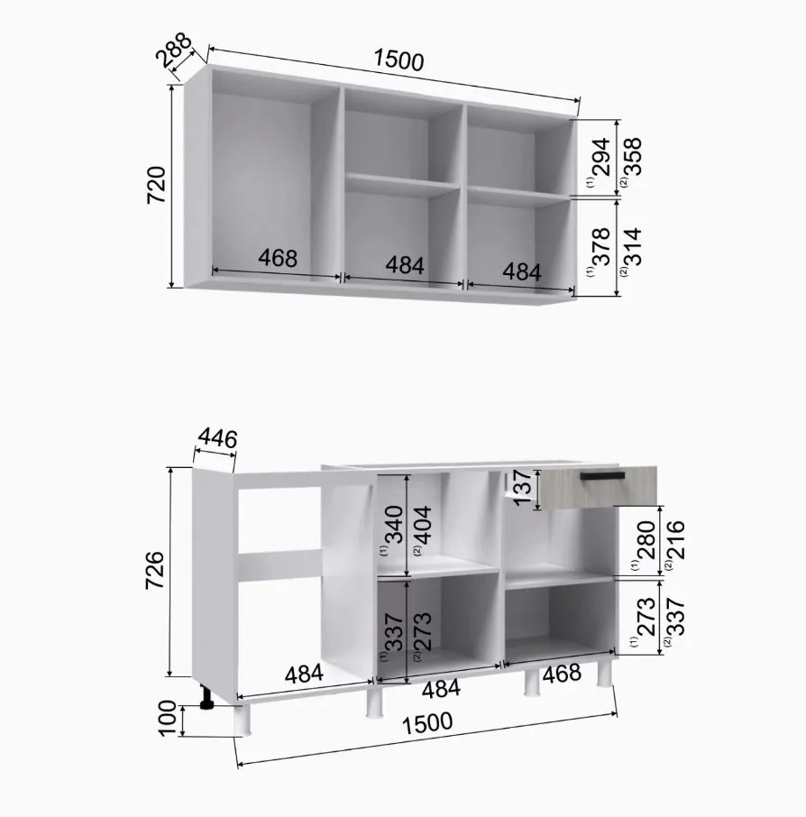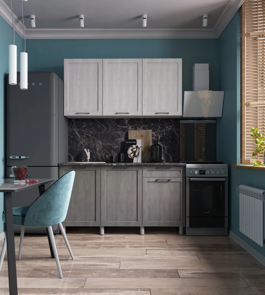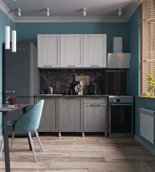 Кухня выполнена в сером цвете, который легко впишется в любой интерьер. Корпус кухни выполнен из качественного ЛДСП с белым тиснением "Древесные поры", а фасады - из МДФ. Это обеспечивает прочность и долговечность конструкции.