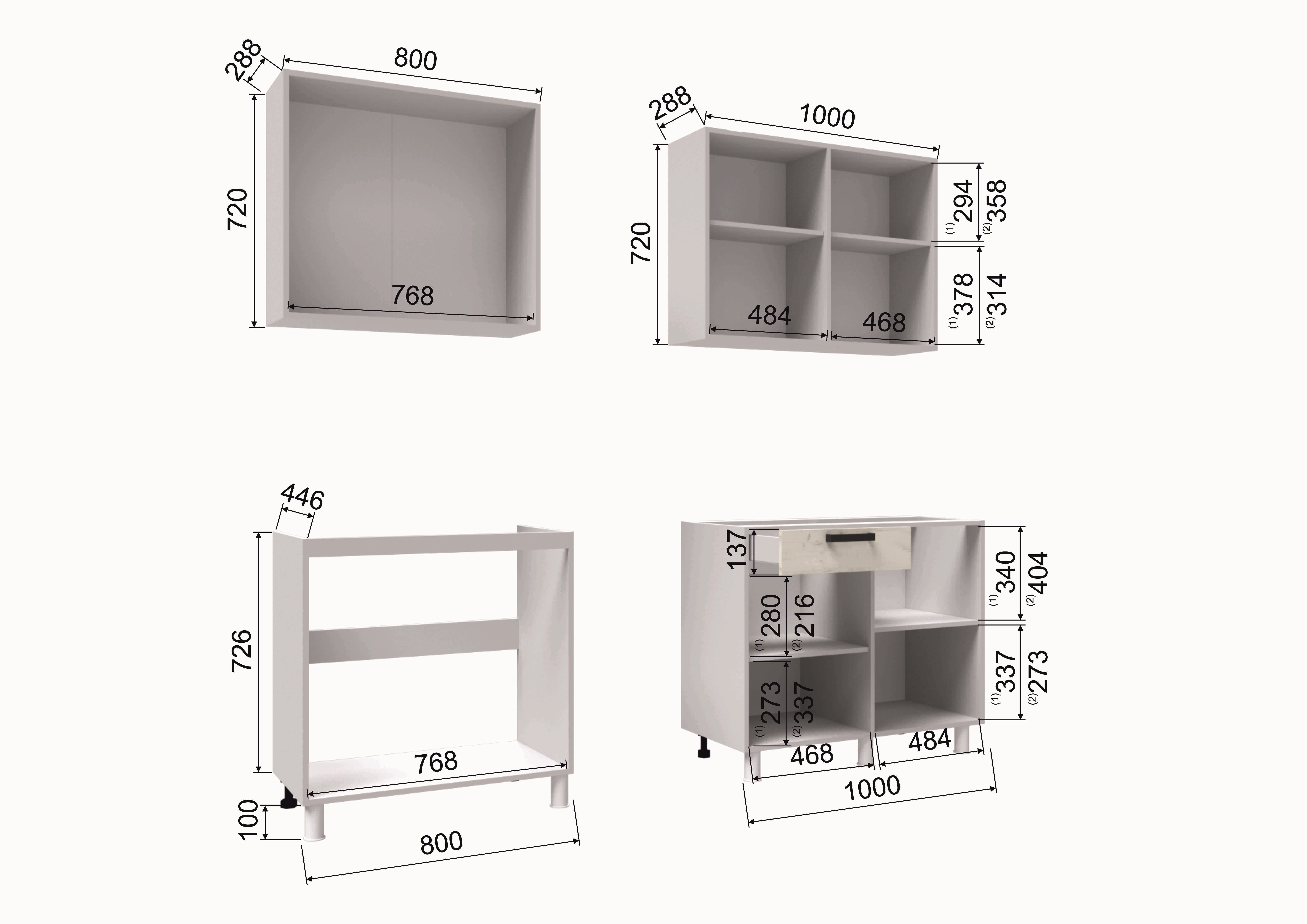 Роликовые направляющие обеспечивают плавное и бесшумное открывание ящиков, а петли без доводчика гарантируют долгий срок службы мебели.