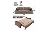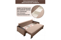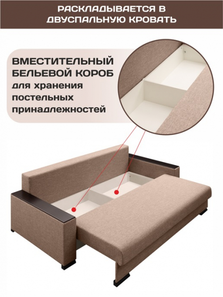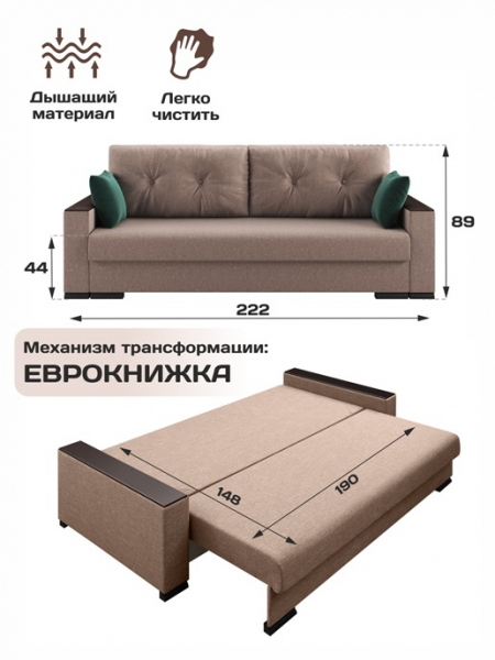 Диван имеет просторное спальное место с блоком независимых пружин Antinoise , доступ к которому обеспечивается с помощью удобного механизма трансформации “Еврокнижка”. Диван раскладывается легко и быстро, превращаясь в удобную кровать. Вместительный короб для белья, разделенный на два отсека, поможет удобно организовать хранение постельных принадлежностей.Две опорные подушки отлично поддерживают спину. На широких подлокотниках расположены деревянные накладки, поэтому на них удобно ставить чашки, а также класть предметы, которые хотелось бы держать под рукой.