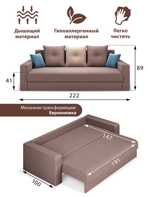 Этот мягкий диван отличает невероятный комфорт. Диван-кровать на основе блока независимых пружин ANTINOISE − одна из самых удачных моделей для здорового сна и отдыха. Блок независимых пружин придает дивану ортопедический эффект и делает его более износостойким и пригодным для ежедневного использования.