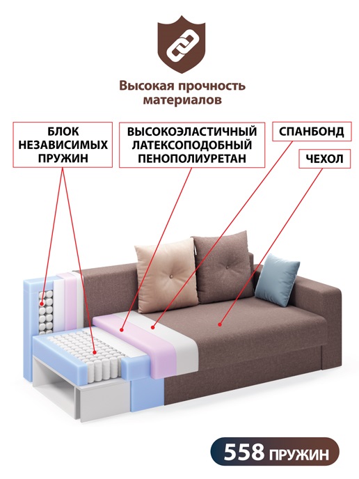 Для улучшения эксплуатационных качеств изделия периметр пружинного блока усилен коробом из высокопрочного пенополиуретана повышенной упругости. В качестве изолирующего слоя между пружинным блоком и наполнителями матраса используется материал высокой плотности «Спанбонд Протект», который уменьшает трение между настилочными слоями и пружинным блоком в диване, защищая изделие от износа. Сверху блока − слой высокоэластичного пенополиуретана. Такое сочетание позволяет лучше отдохнуть, снять напряжение и усталость, разгрузить позвоночник.