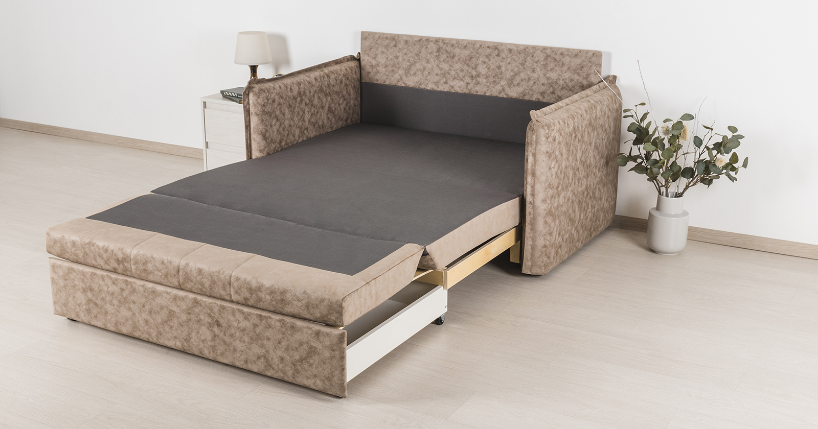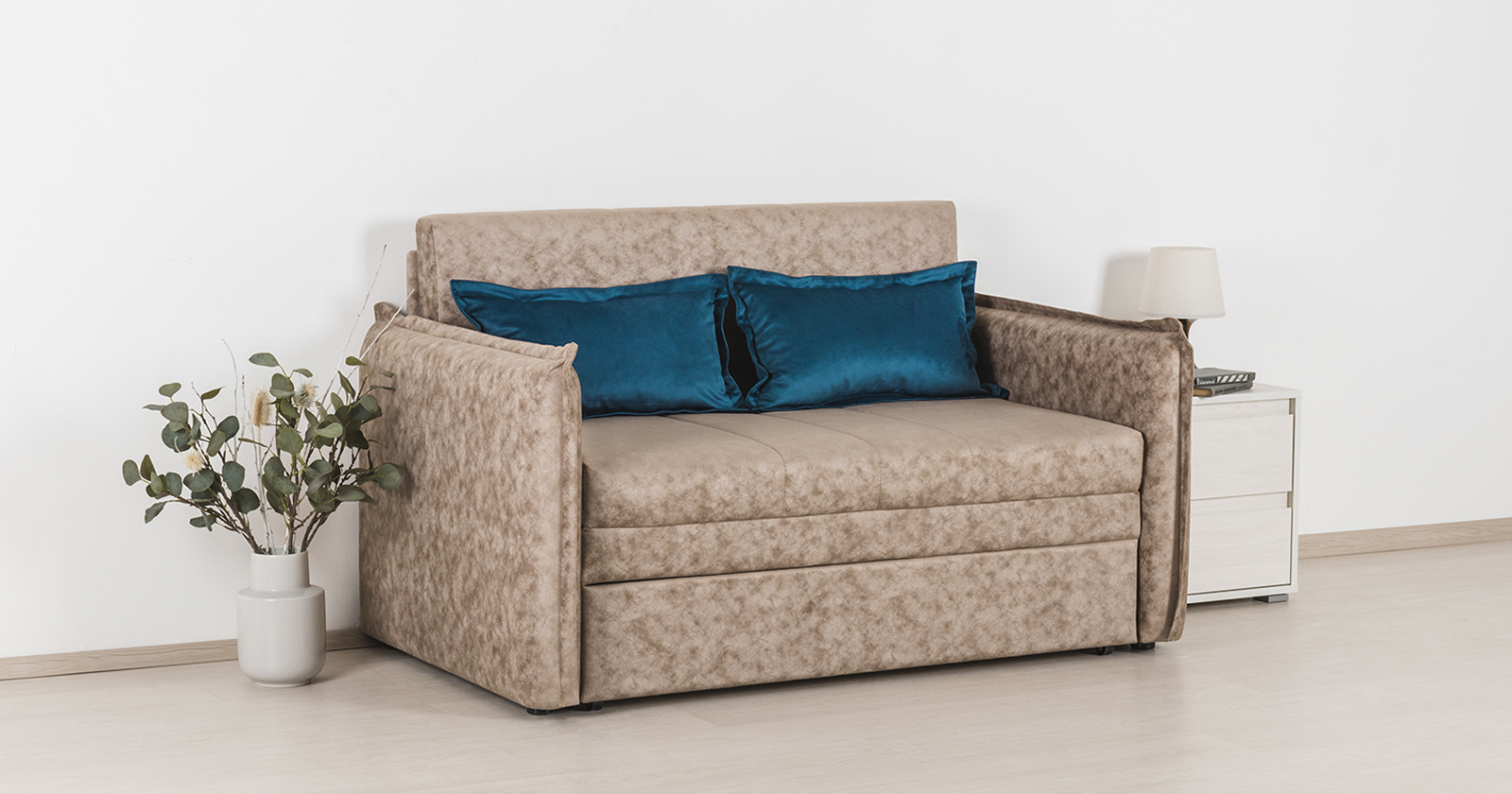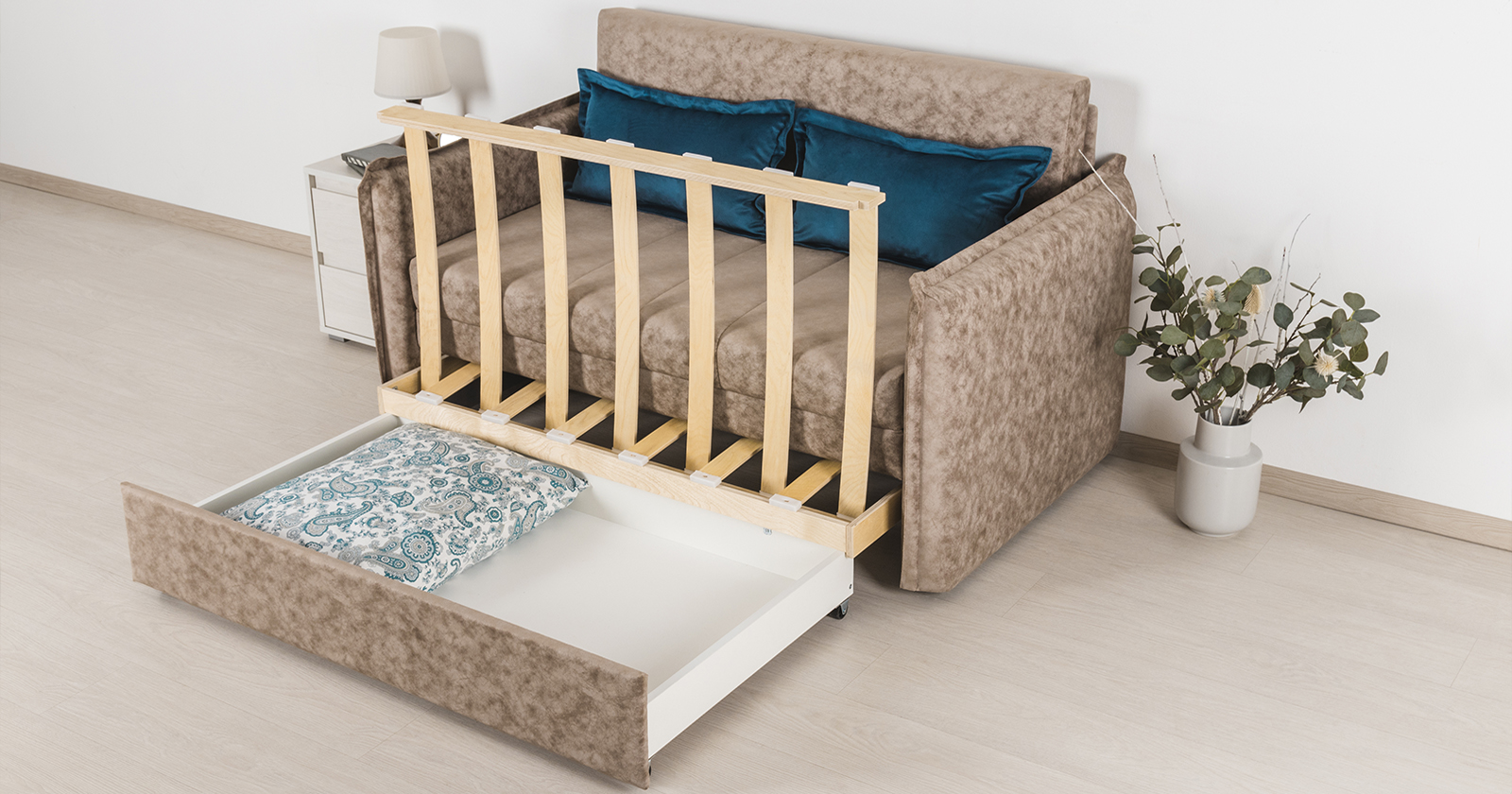 Модный компактный раскладной диванчик для гостиных или детских комнат. Простой и надежный механизм трансформации на каждый день обеспечит удобным спальным местом ребенка или подростка. Может использоваться в качестве гостевого спального места для взрослого, есть небольшой бельевой ящик. Опоры - цвет черный, круглые, высота 25 мм., выполнены из высококачественного пластика. Прочность конструкции ножек обеспечена ребрами жесткости и внутренним креплением под фурнитуру.