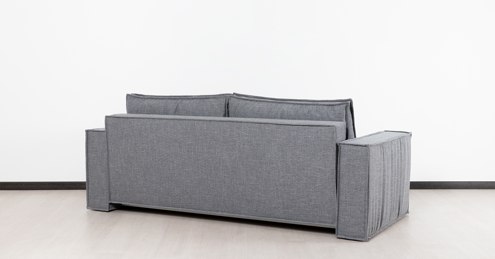 Стильный диван в трендовом лаконичном дизайне. Вывернутые швы подчеркивают геометрические формы дивана. Модная деталь – чехол со свободной посадкой и декоративными складками.Задняя сторона спинки выполнена в ткани основы.
