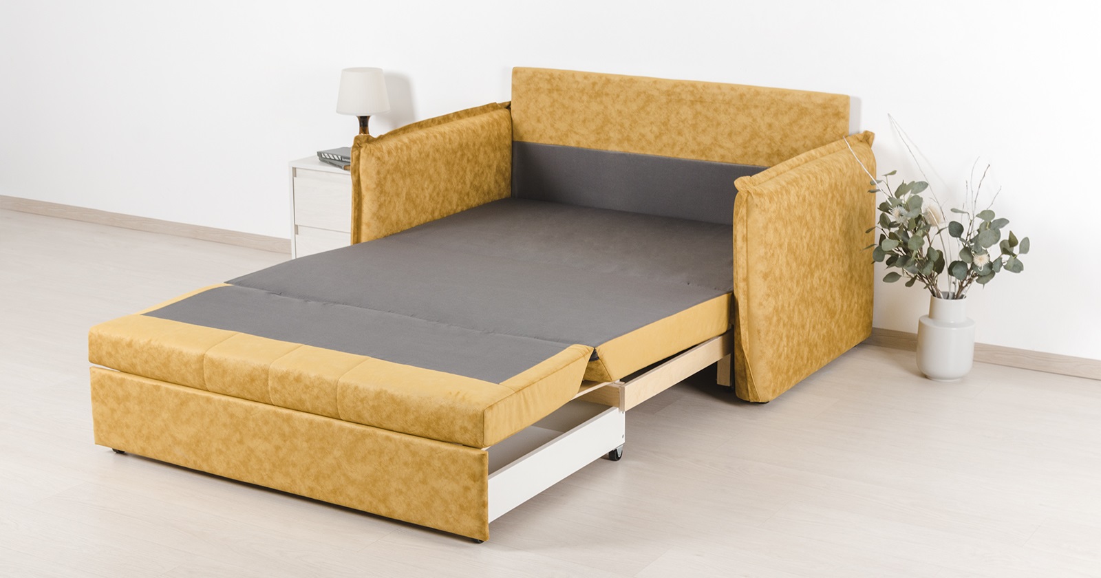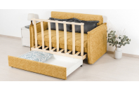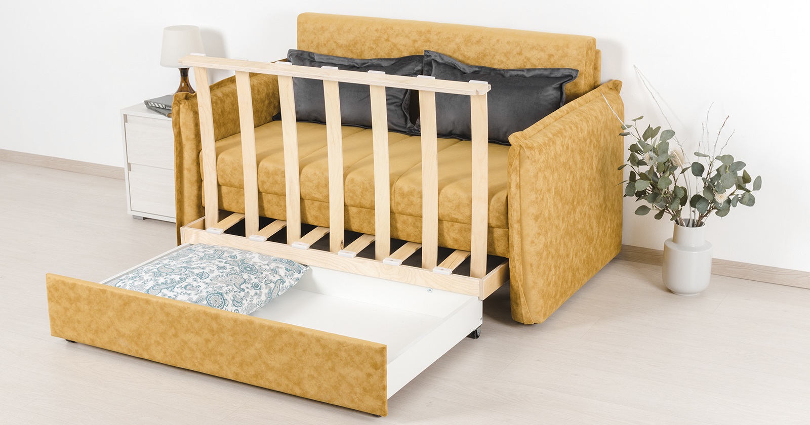 Модный компактный раскладной диванчик для гостиных или детских комнат. Простой и надежный механизм трансформации на каждый день обеспечит удобным спальным местом ребенка или подростка. Может использоваться в качестве гостевого спального места для взрослого, есть небольшой бельевой ящик. Опоры - цвет черный, круглые, высота 25 мм., выполнены из высококачественного пластика. Прочность конструкции ножек обеспечена ребрами жесткости и внутренним креплением под фурнитуру.