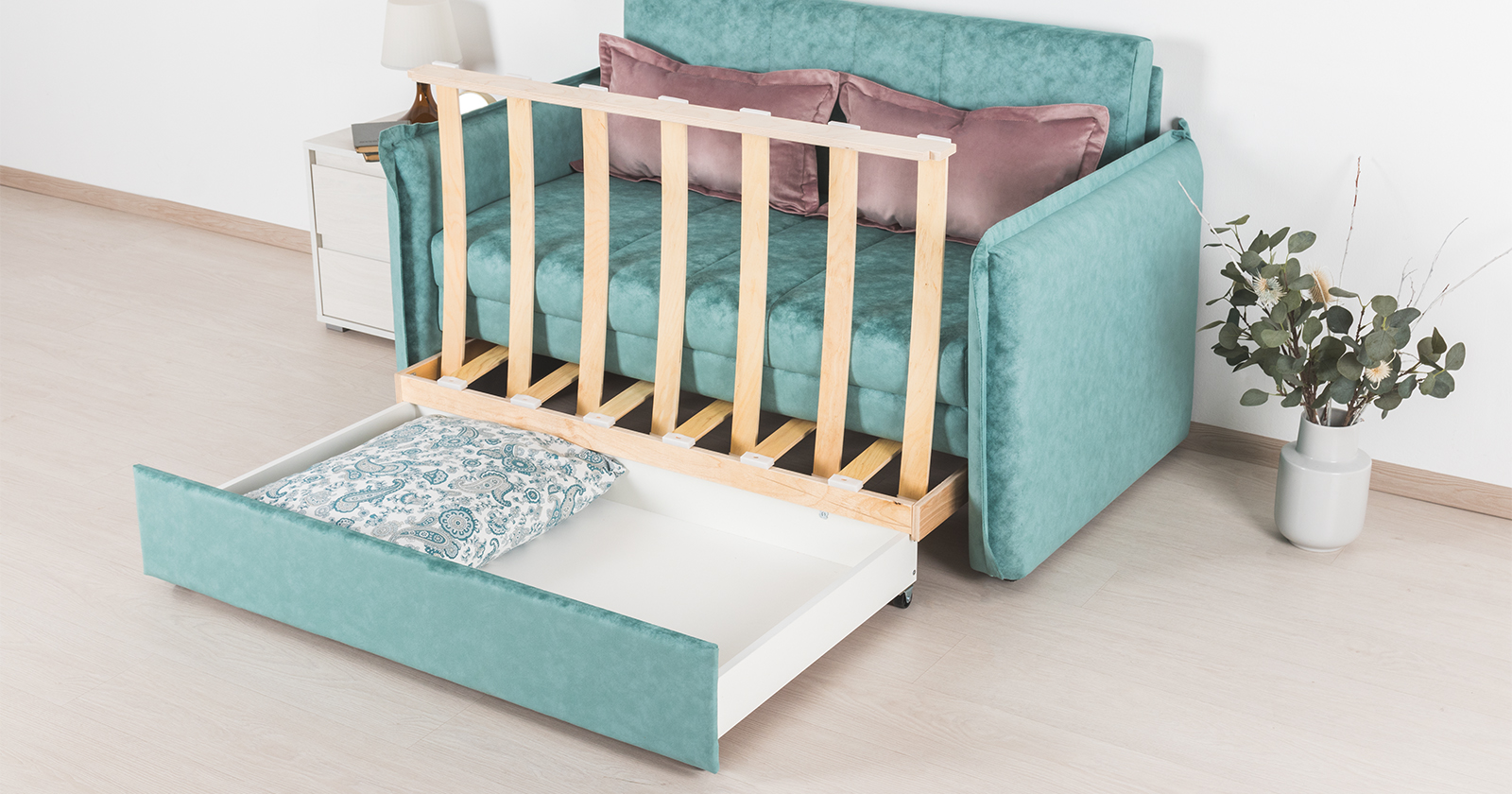Модный компактный раскладной диванчик для гостиных или детских комнат. Простой и надежный механизм трансформации на каждый день обеспечит удобным спальным местом ребенка или подростка. Может использоваться в качестве гостевого спального места для взрослого, есть небольшой бельевой ящик. Опоры - цвет черный, круглые, высота 25 мм., выполнены из высококачественного пластика. Прочность конструкции ножек обеспечена ребрами жесткости и внутренним креплением под фурнитуру.