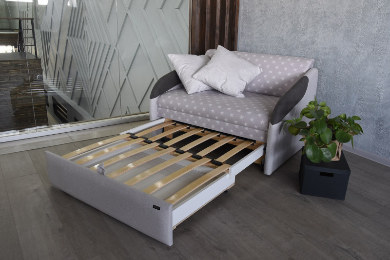 Представленная модель кресла идеальна для использования в небольших городских квартирах. Сиденье выполнено из высокоэластичного ППУ и имеет надежное основание на ДСП. Кресло трансформируется в кровать при помощи механизма «Вперед выкатной». Модель предусматривает небольшой ящик для хранения белья.