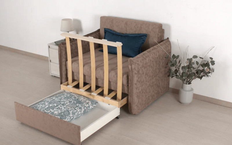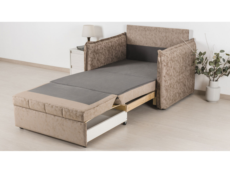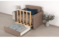 Модный компактный раскладной диванчик для гостиных или детских комнат. Простой и надежный механизм трансформации на каждый день обеспечит удобным спальным местом ребенка или подростка. Может использоваться в качестве гостевого спального места для взрослого, есть небольшой бельевой ящик. Опоры - цвет черный, круглые, высота 25 мм., выполнены из высококачественного пластика. Прочность конструкции ножек обеспечена ребрами жесткости и внутренним креплением под фурнитуру.