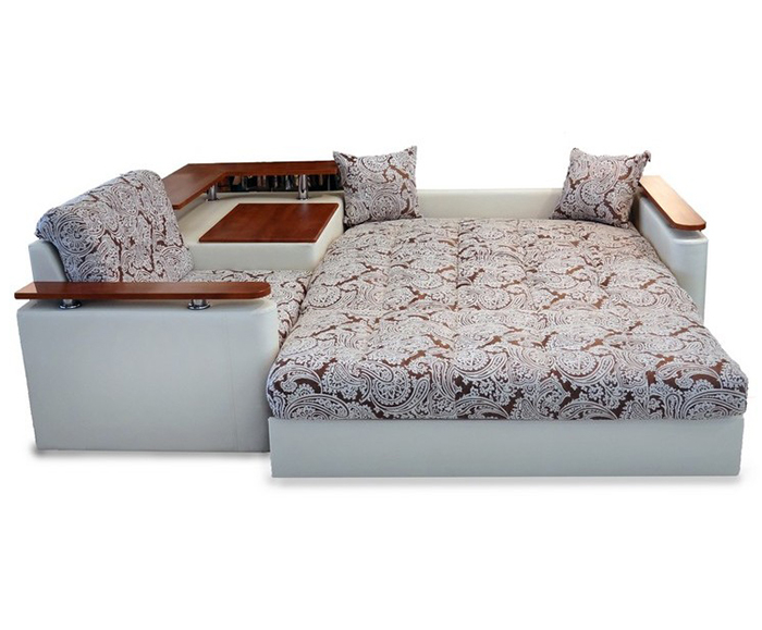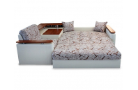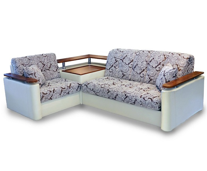 Этот многофункциональный предмет интерьера станет любимым местом препровождения небольшой семьи. Высокая откинутая назад спинка этого дивана позволит расслабить позвоночник в сидячем положении. Боковые поверхности этой конструкции имеют обтекаемую форму и деревянные подлокотники. Угловой элемент этого изделия выполнен в качестве небольшого столика,под которым расположена ёмкость для хранения. В разобранном виде представленный диван обеспечит прекрасный отдых после тяжёлого дня. Идеально ровное место для сна находится на большом расстоянии от поверхности пола. Эластичный формовой пенополиуретан, служащий наполнителем для матраса имеет лечебное назначение, а также показан для аллергиков. Для раскладывания вышеупомянутого механизма нужно приподнять место для сидения до короткого, резкого звука и потянуть в свою сторону.