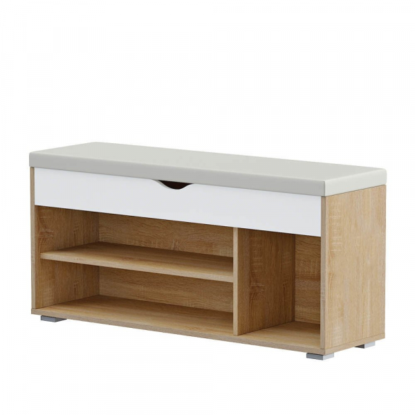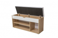 Изделие оборудовано двумя широкими полками и открытой нишей. Поверхность представляет собой мягкое откидное сиденье, под которым расположен удобный ящик для хранения инструментов или чистящих средств. Основание оборудовано подпятниками для сохранения целостности напольного покрытия. Превосходно сочетается с любой другой мебелью для дома.
