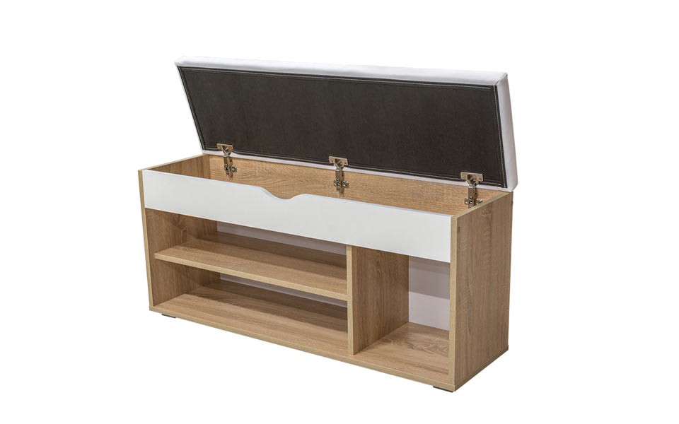 Изделие оборудовано двумя широкими полками и открытой нишей. Поверхность представляет собой мягкое откидное сиденье, под которым расположен удобный ящик для хранения инструментов или чистящих средств. Основание оборудовано подпятниками для сохранения целостности напольного покрытия. Превосходно сочетается с любой другой мебелью для дома.