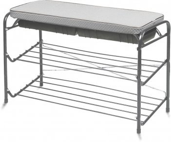 2-х ярусная этажерка ЭТП 3/С с мягким удлиненным сидением со встроенным ящиком в сиденье для хранения принадлежностей по уходу за обувью имеет:усиленный металлический каркас;прочный материал сиденья , устойчивый к истиранию и легкий в чистке;прочное покрытие каркаса этажерки устойчиво к механическим воздействиям;пластиковые колпачки на ножках защищают поверхность пола от царапин.