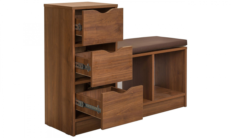 Тумба для прихожей Лайт 10.84 – отличное решение для небольшой прихожей. Конструкция тумбы включает в себя мягкое сиденье для комфортного переобувания, две открытые ниши для размещения обуви и три выдвижных ящика для хранения мелочей, от щеток для обуви до тапочек. Поверхность тумбы может быть использована в качестве дополнительной полки для головных уборов и перчаток.