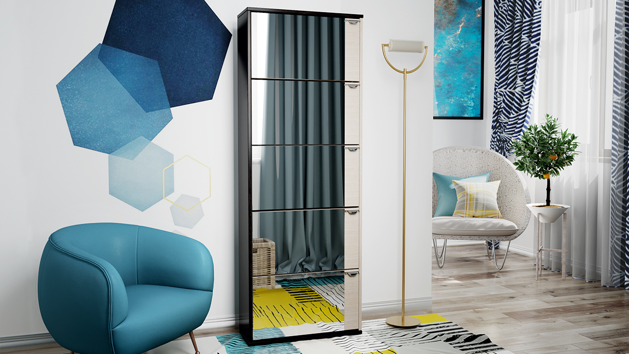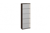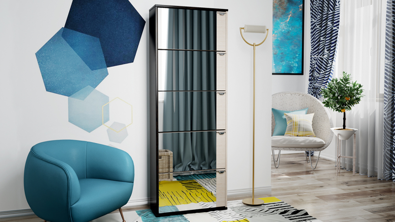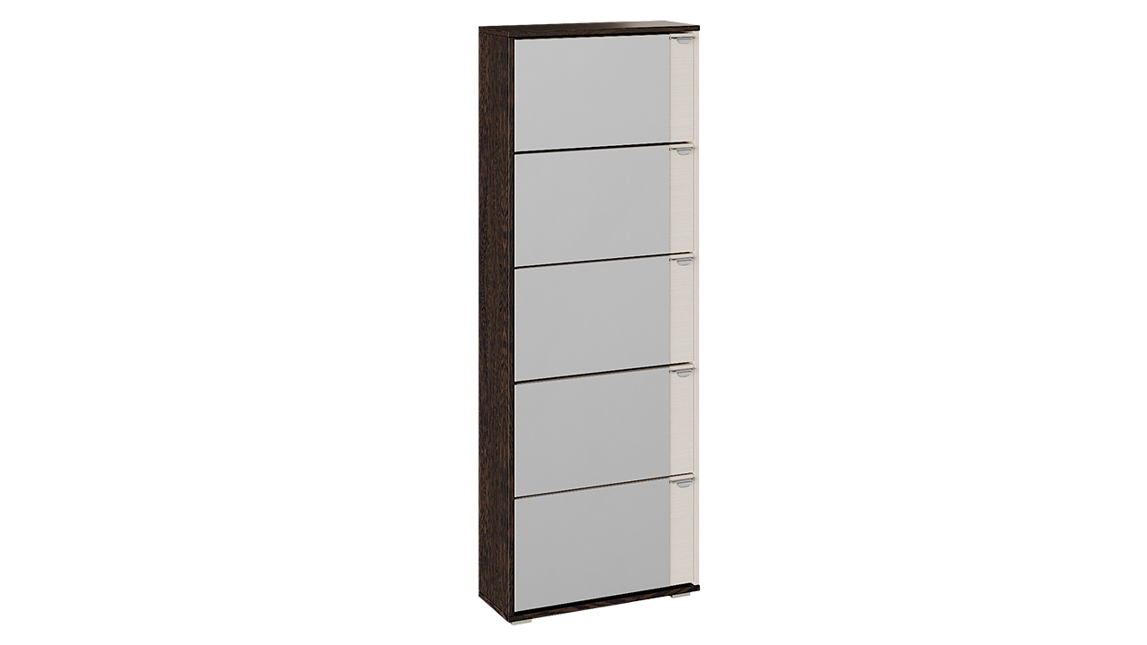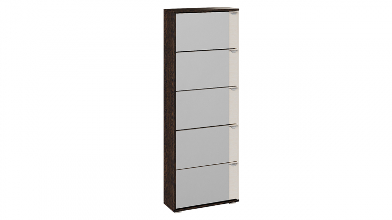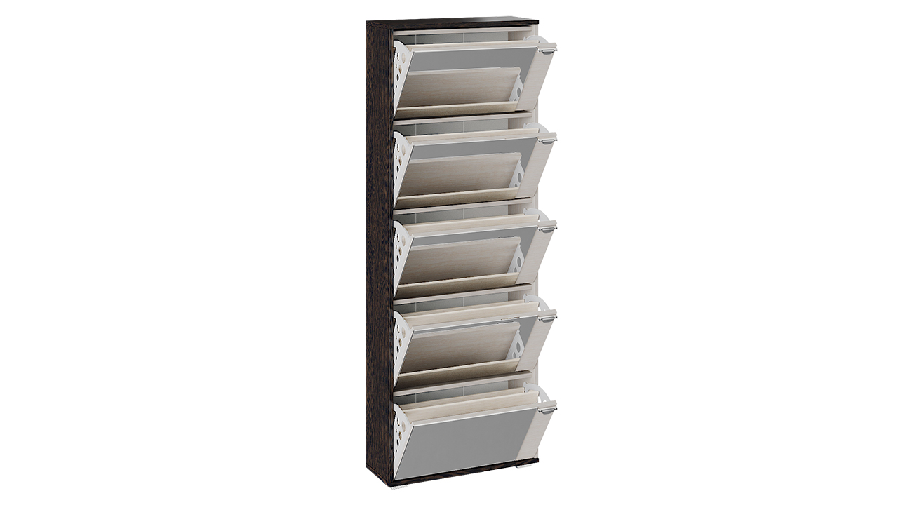 Тумба для обуви выполнена в современном минималистичном стиле. Фасад модели декорирован зеркалами, что делает тумбу еще более функциональной. Тумба узкой формы и достаточно высокая, комплектована пятью откидными ящиками, в которых удобно хранить обувь.