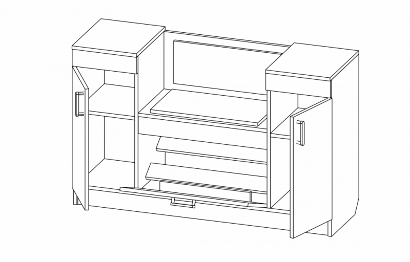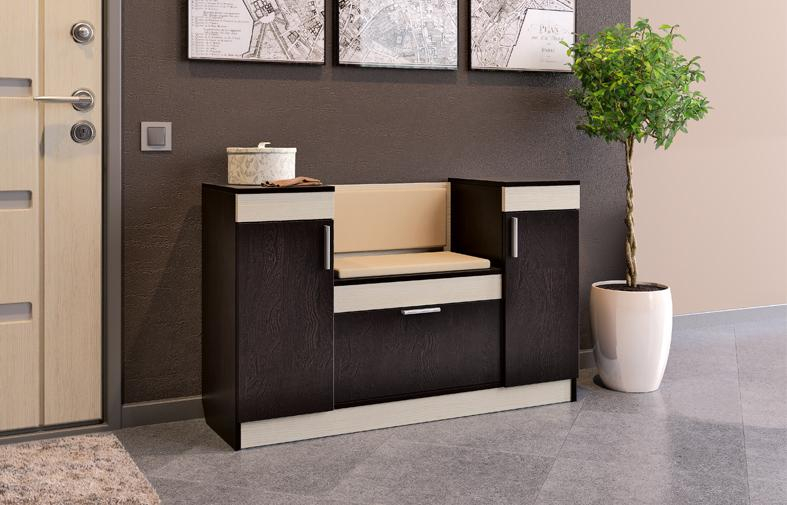 Оригинальная обувница «Фиеста-2» – замечательное решение для прихожих небольших размеров. Её стильный дизайн невольно бросается в глаза и обеспечивает помещениям более привлекательный вид. Слева и справа от центральной части расположено два вместительных отсека с распашными дверцами. Между ними имеется мягкое удобное кресло, под которым предусмотрена секция с дверцей откидного типа. Все фасады тумбы оснащены удобными ручками серебристого цвета и привлекают внимание оригинальным дизайном за счёт контрастной цветовой гаммы. Поверхности боковых отсеков можно использовать как подставки для сувениров или ваз с цветами.