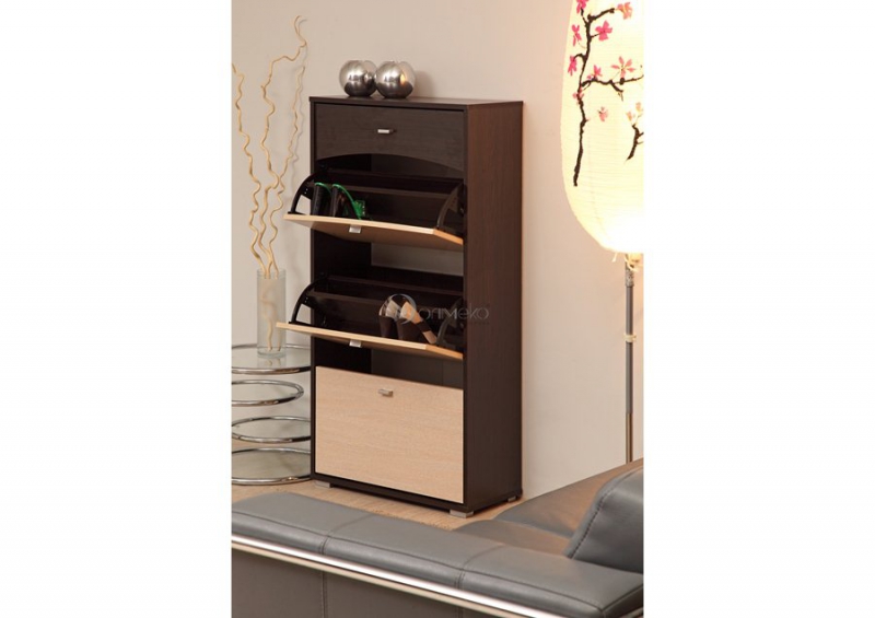 Презентабельная обувница «Фиеста-6» – современный представитель удобной корпусной мебели, используемой для хранения обуви в прихожих. Благодаря небольшим размерам её можно поставить даже в самое скромное по площади помещение. Оригинальная конструкция откидных дверец, расположенных в центре, позволяет хранить обувь с максимальной экономией полезного пространства. В верхней части расположен небольшой выдвижной ящичек для мелочей, а в самом низу – вместительный отдел с откидной дверцей. Помимо грамотно продуманной конструкции эта тумба привлекает контрастной цветовой гаммой и стильной фурнитурой.