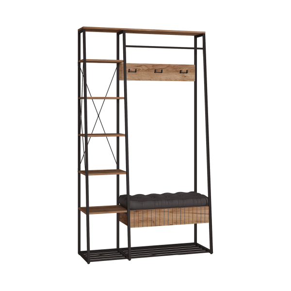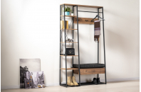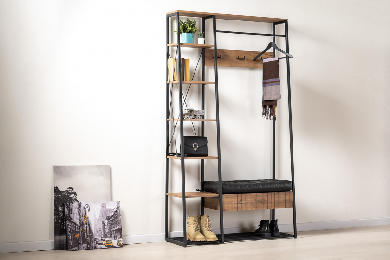 Компактная открытая прихожая выполнена в стиле лофт. Металлический каркас придает прочность конструкции и стиль. Удобная банкетка с мягким сидением позволит комфортно обуться. Внизу расположена металлическая съемная полка для обуви. При необходимости полку всегда можно помыть. Под сидением удобный выдвижной ящик для хранения аксессуаров для ухода за обувью. Направляющие скрытого монтажа с доводчиками.