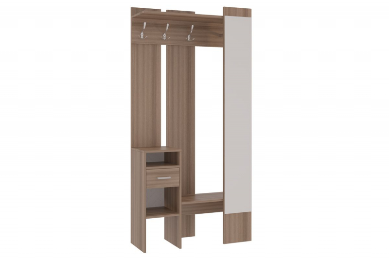 «Агата» создана для Вашей прихожей – Вы можете повесить одежду и сумку на металлические крючки, шляпки положить на полку сверху, нужные мелочи – в выдвижной ящик. На открытых полках можно разместить зонты, перчатки и шарфы. Лицевая панель с зеркалом во весь рост обеспечит комфорт и уют Вашей прихожей. «Агата» - стильная, функциональная, занимает минимум пространства.