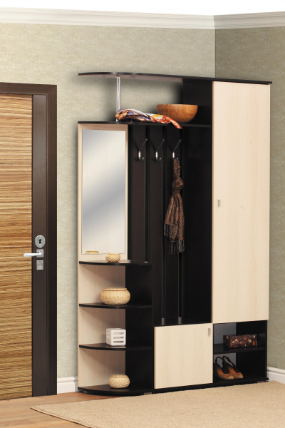 Шкаф комбинированный Кармен-7 имеет всё необходимое, чтобы заменить полноценную прихожую. Слева – элегантное зеркало и открытая секция с закруглёнными угловыми полками. Справа располагается вместительный отдел с глухой дверцей, под которым предусмотрена открытая ниша с полкой, где можно хранить обувь или сумки. Центральную часть занимают открытая вешалка с тремя металлическими крючками и небольшая тумба с распашной створкой. Вверху предусмотрена зона для головных уборов, опирающаяся на короткую хромированную трубу.