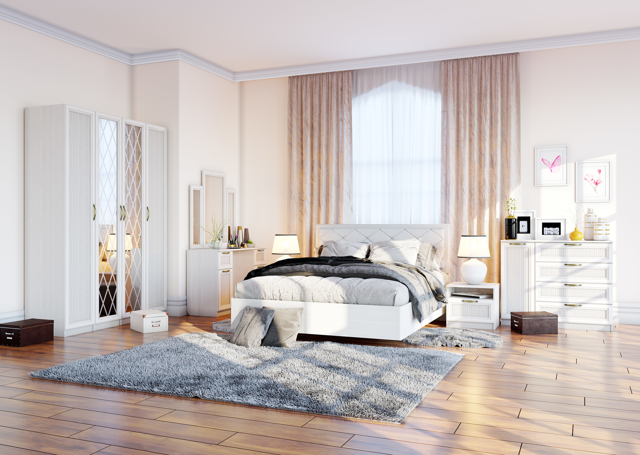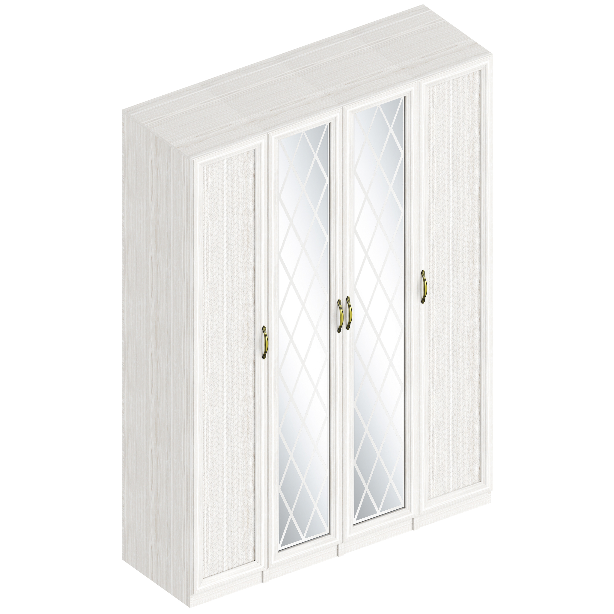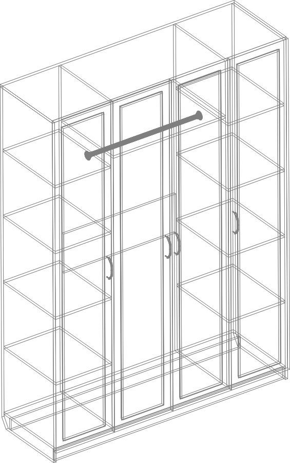 Большой и стильный четырехдверный шкаф для одежды Александрия Са-01 в котором поместится огромное количество вещей. Для этого в шкафу предусмотрены множество полок и специальная штанга для плечиков. На центральных дверцах шкафа установлены два больших зеркала с пескоструйным рисунком в виде ромбов. Мебель из модульного набора Александрия отличается изысканным, элегантным дизайном и спокойными светлыми тонами в оформлении. Модульность набора мебели позволяет создать свой собственный, неповторимый комплект, который идеально впишется в интерьер любого помещения.