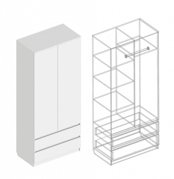 Оборудован удобными ящиками на шариковых направляющих, в которые будет легко сложить одежду, а так же в верхней части - отделением со штангой с большим пространством для хранения вещей и полочками.