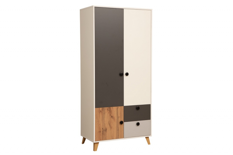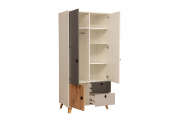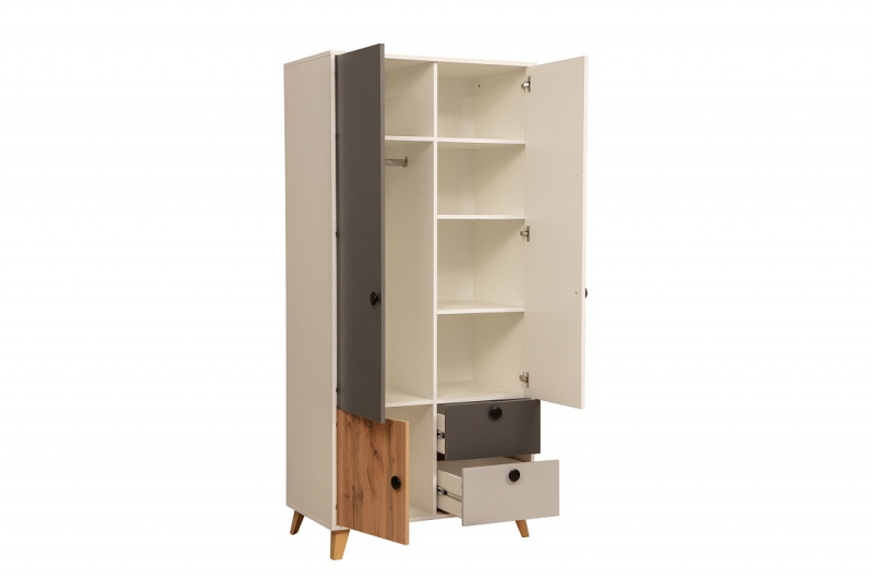 Двери шкафа распашные на петлях без доводчиков. За дверью слева- отделение с полкой и горизонтальной штангой. Фасад разбит на две части по цвету и конструктивно. Справа-отделение с полками за распашной дверью, ниже- два вместительных выдвижных ящика.