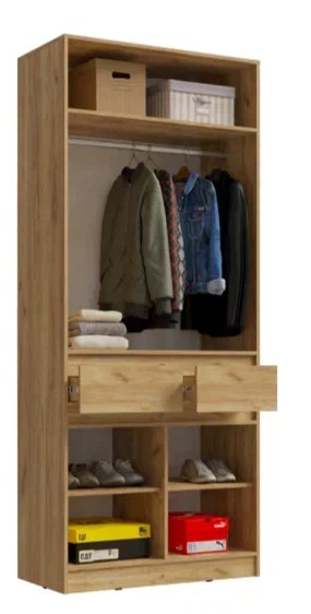 Шкаф комплектуется штангой для для размещения одежды на плечиках, в центральной части расположены 2 выдвижных ящика. Вместо ручек предусмотрены утопленные вглубь планки, которые создают нишу за фасадом для захвата и открывания рукой.