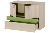 Оригинальная конструкция, сочетающая в себе удобство вместительных выдвижных ящиков и закрытых дверцами полок, может использоваться в разных вариантах. Тумба станет функциональным дополнением меблировки детской комнаты или гармоничным элементом гарнитура, оформленного в том же стиле, который вы можете подобрать самостоятельно из модульной серии «Киви».