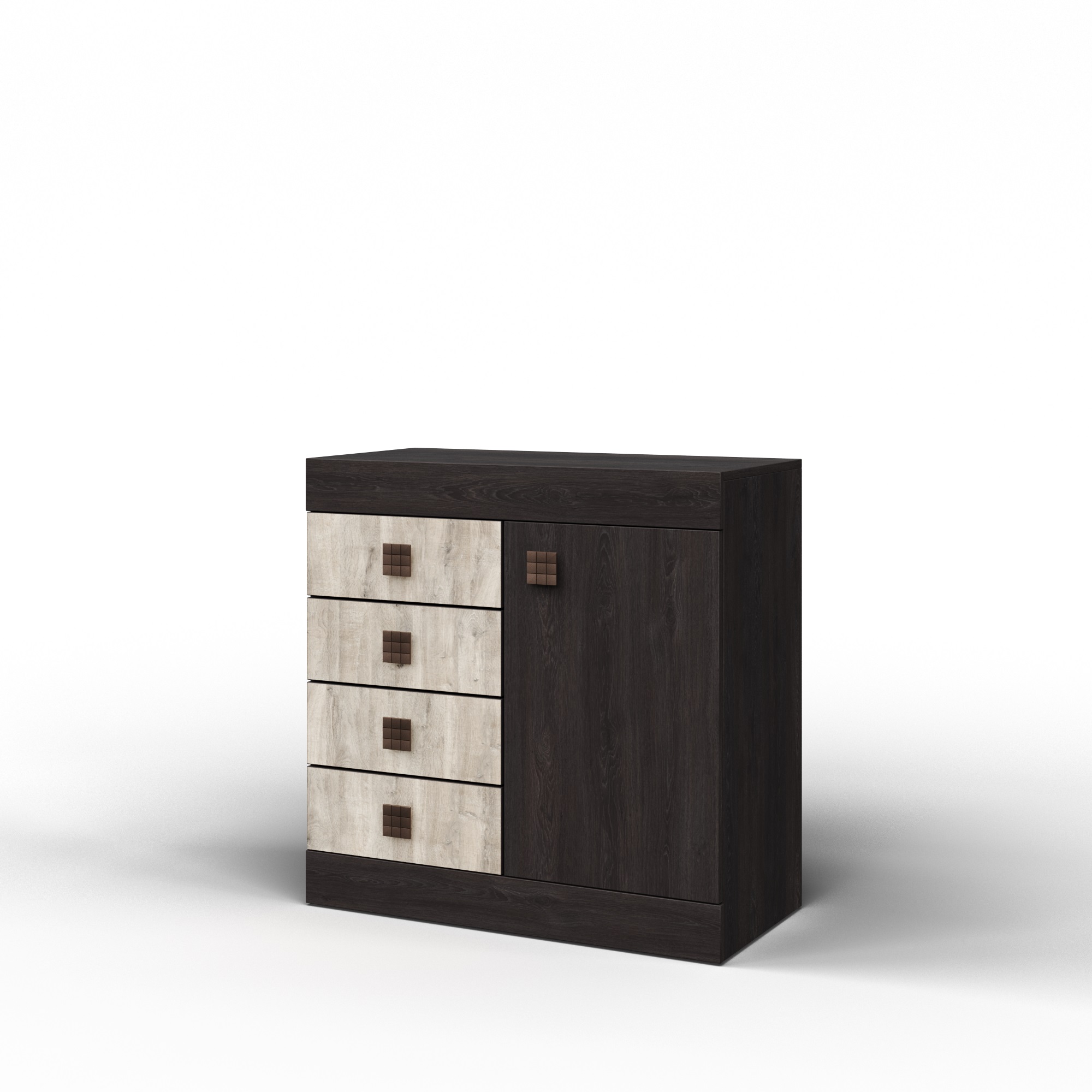 Стильный комод 1Д4Я Лондон выполнен в мягком цвете дуб сонома/капучино. Комод оснащен четырьмя вместительными выдвижными ящиками на шариковых направляющих и отделением с полкой за распашной дверкой. Столешница широкая, просторная позволяет разместить элементы декора, фото. Комод Лондон производится из экологически чистых материалов - корпус и фасад из ЛДСП. Торцы защищены кромкой ПВХ. Внешняя простота без вычурности, не отменяет красоту и гармоничность стиля коллекции мебели Лондон. Такой комод станет важным и функциональным предметом мебели, который дополнит интерьер спальни, гостиной или детской комнаты и внесет удобство и уют.