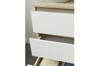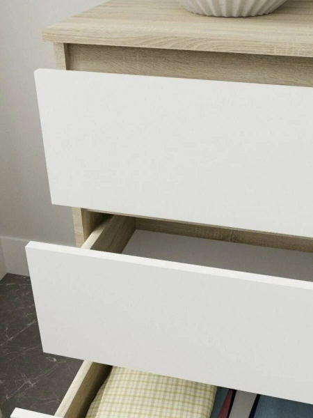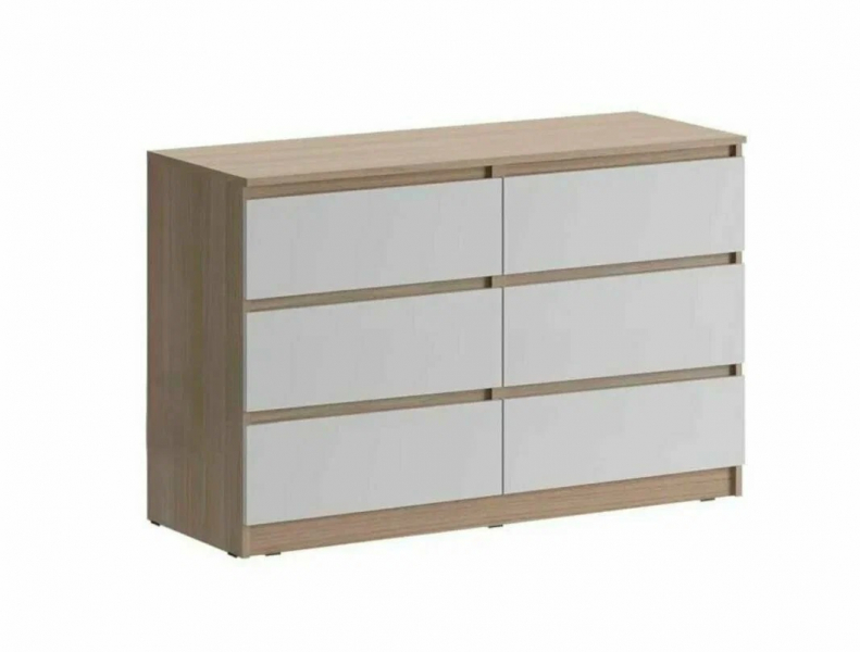Комод Челси Белый глянец/Дуб сонома - это не только стильный предмет интерьера, но и достаточно функциональная вещь для спальни, гостиной, детской, прихожей. Основное его предназначение - хранение одежды, постельного белья и других небольших вещей. Комод имеет шесть выдвижных ящиков, разделен на две секции перегородками, в каждой секции по три выдвижных ящика на роликовых направляющий с использованием механизма полного выдвижения, дно ящика выполнено из лдвп в цвет корпуса, установлен на пластмассовых регулируемых опорах. . На фасадах ящиков отсутствуют ручки, функцию ручек выполняет сам фасад. Открывание ящиков производится за счет пространства между планками и фасадом.